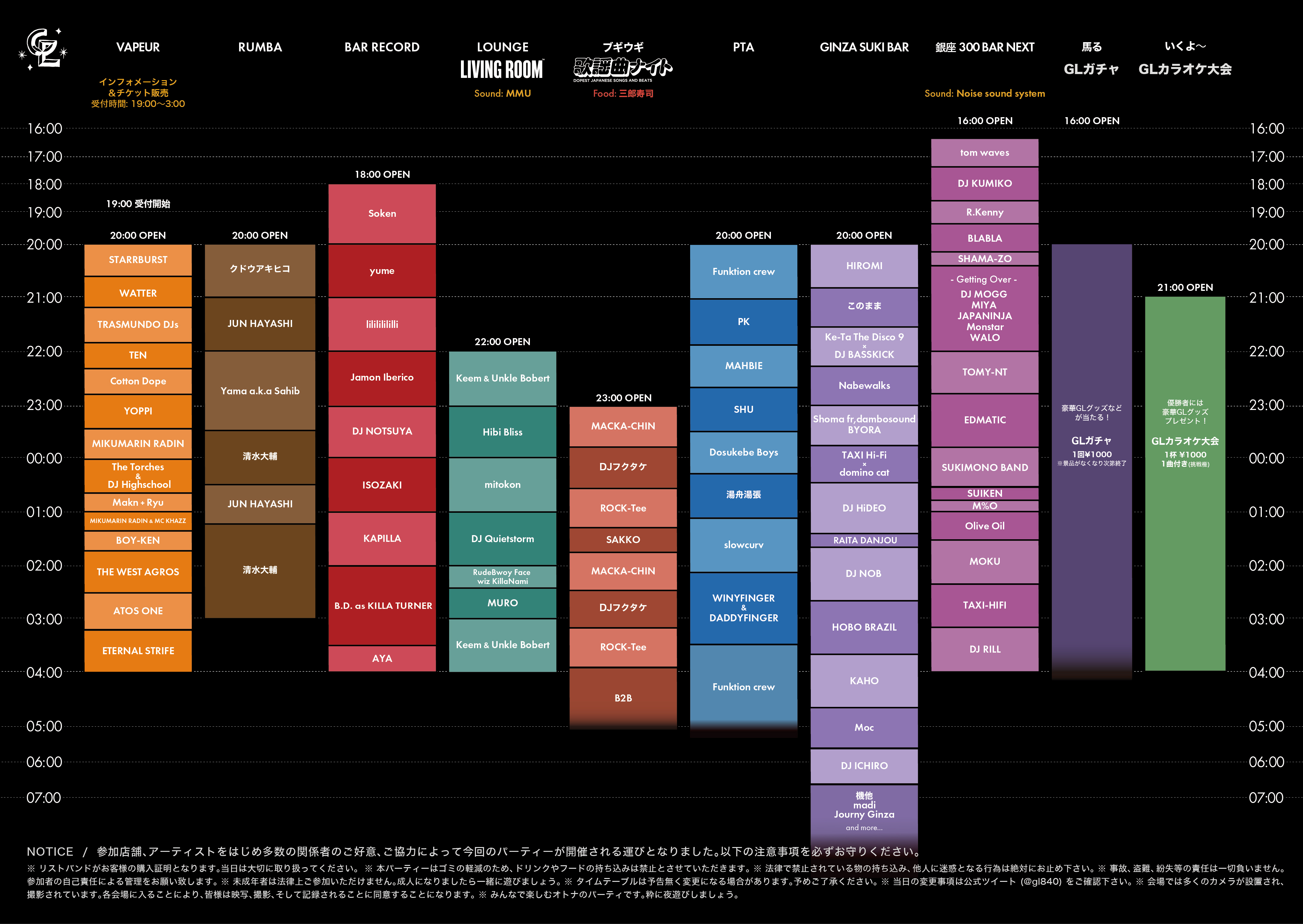 銀座の魅力や特性を活かし、街に点在する個性的なバーやレストラン、ライブハウスをピックアップ。各店舗に一夜限りの特別なステージを作り上げ、豪華アーティスト達のDJ、Live、Live Paint等の最高なパフォーマンスを堪能する事ができます。2014年には日比谷野外音楽堂でのアニバーサリーコンサートを開催し大成功を収めました。